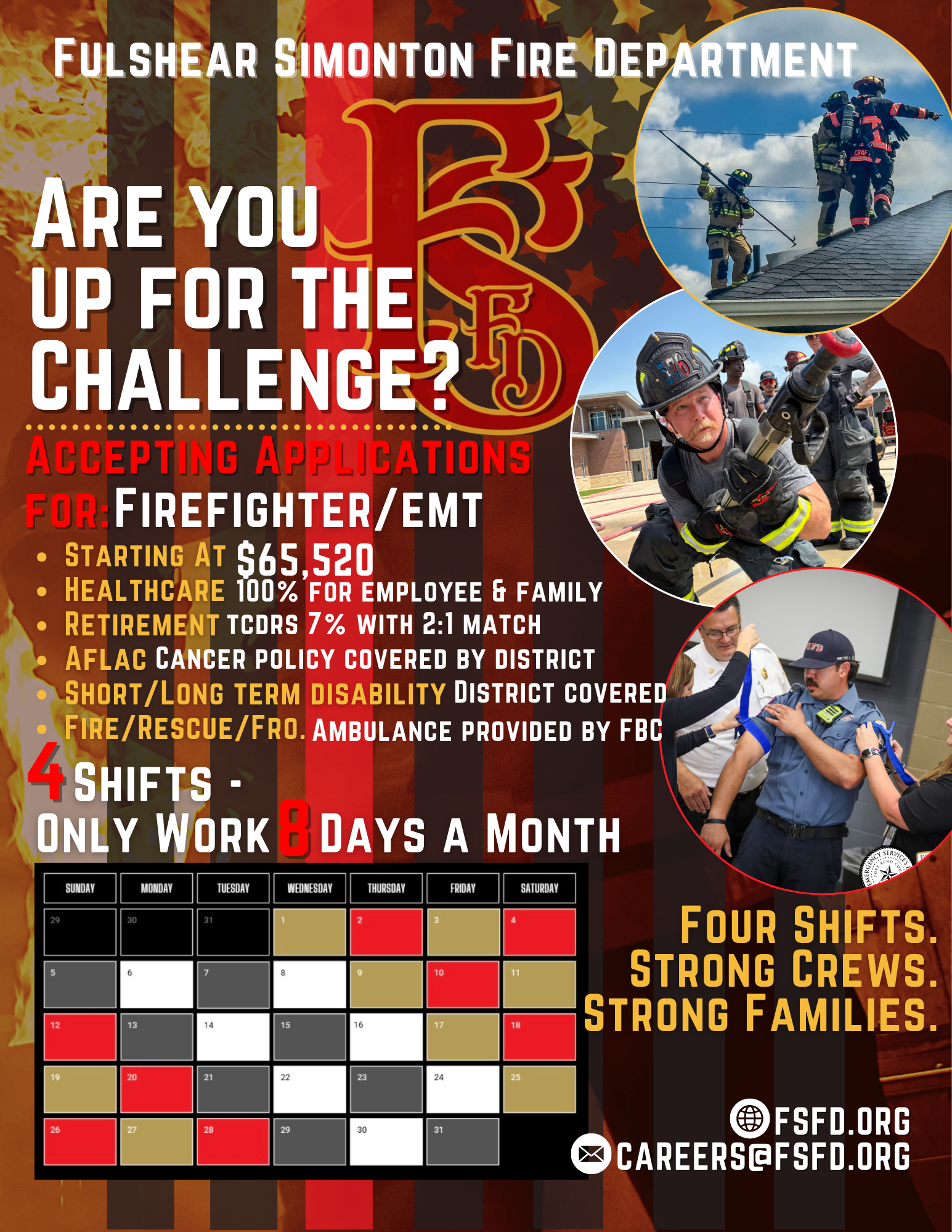 If you’re looking for a Firefighter/EMT career that offers competitive pay, outstanding benefits, and a schedule built for work-life balance — FSFD wants to hear from you.